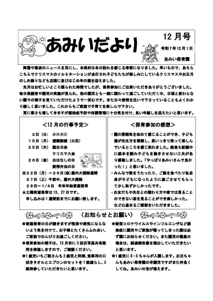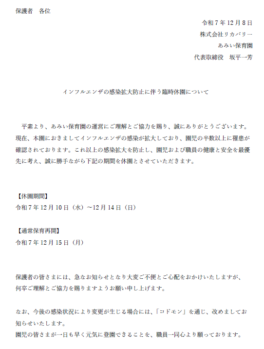 インフルエンザの感染拡大防止に伴い臨時休園とさせていただきます。 何卒ご理解とご協力を賜りますようお願い申し上げます。 【休園期間】 令和7年12月10日(水)~12月14日(日) 【通常保育再開】 …